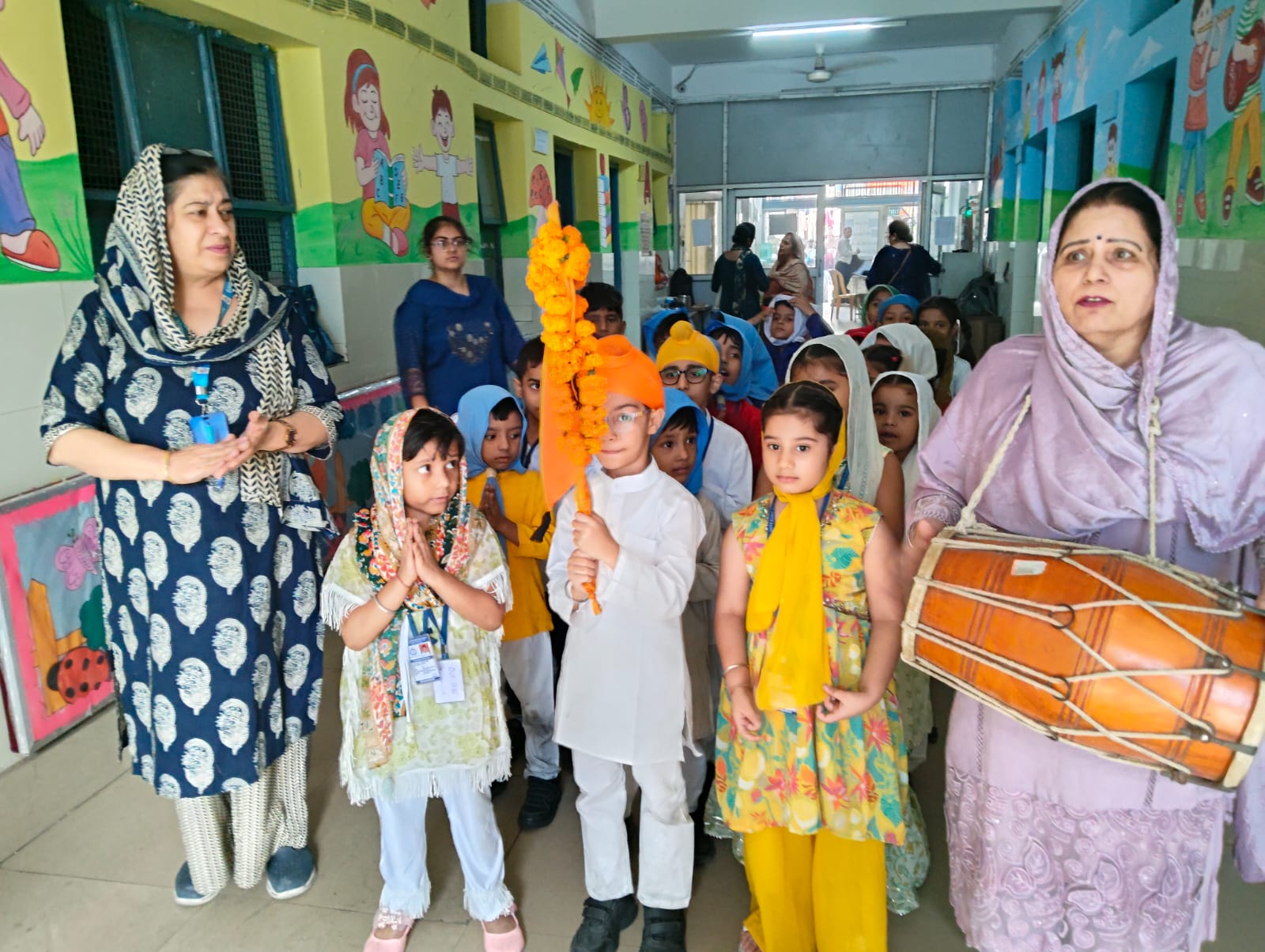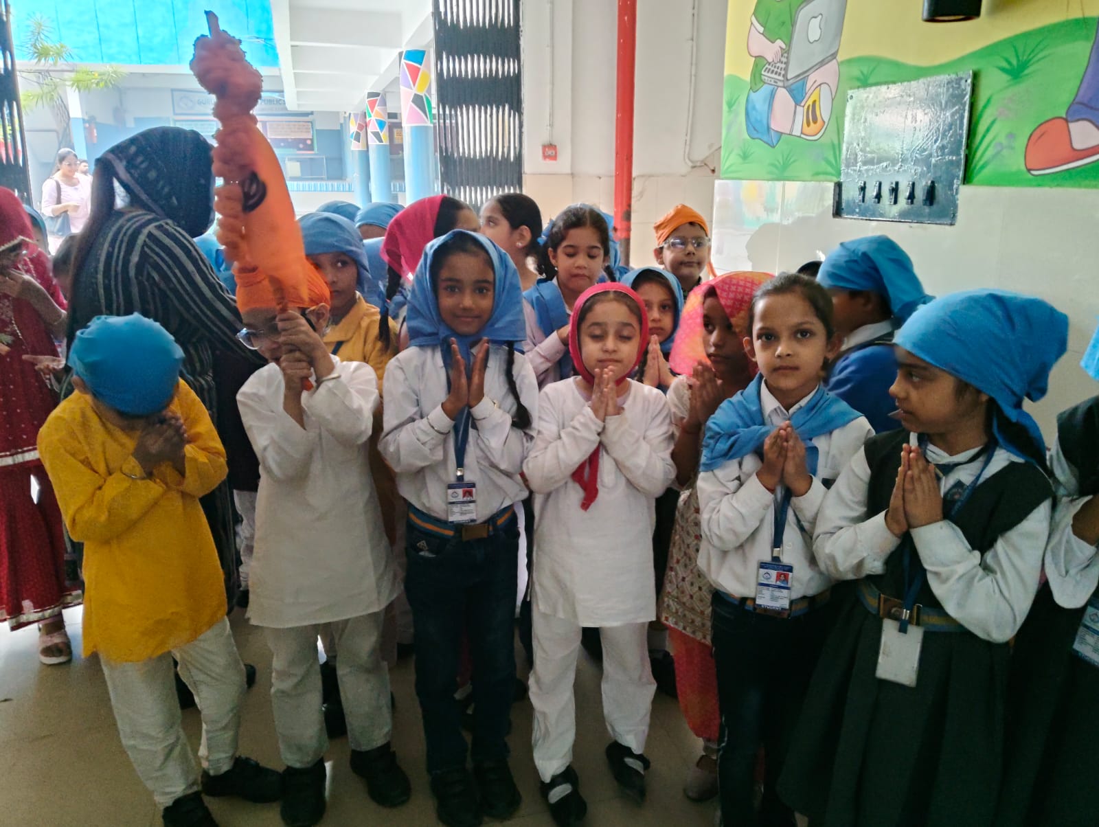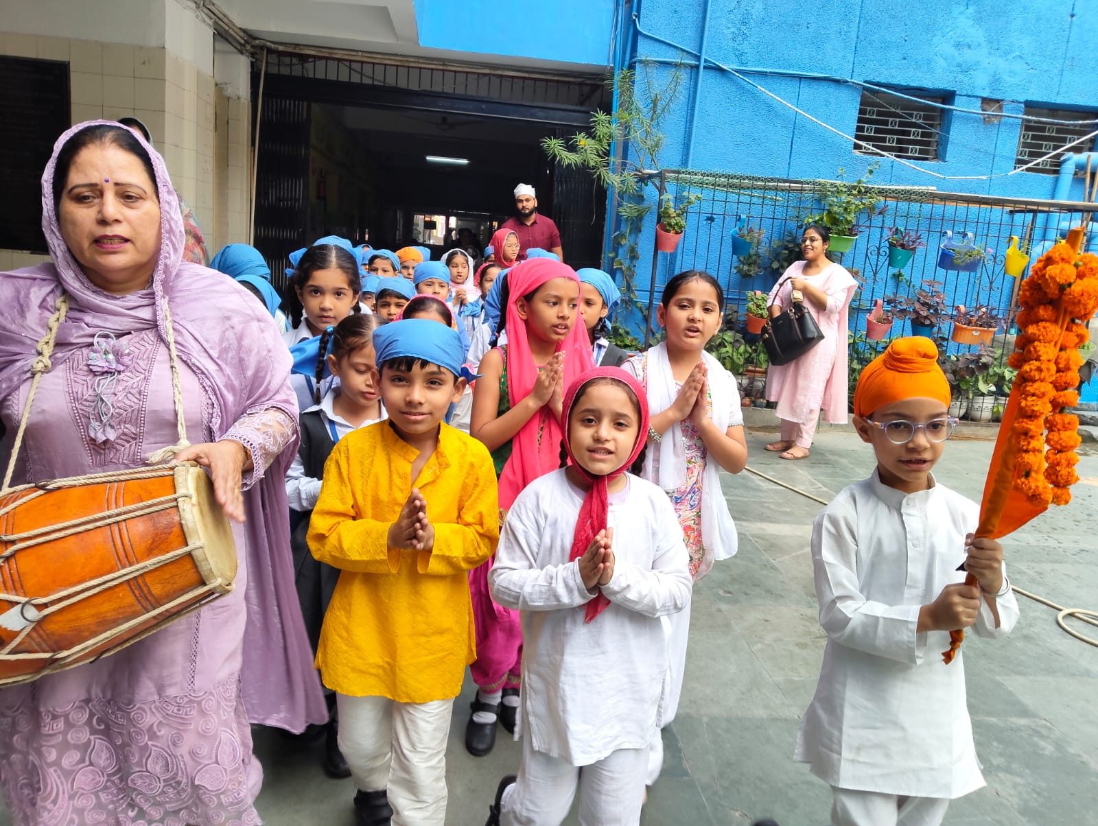 Description : Celebration of Guru Nanak Dev Ji’s Jayanti Guru Nanak Dev Ji’s Gurpurab was celebrated with great devotion by students from Nursery to Grade 2. The children participated enthusiastically in a Prabhat Pheri around the school and nearby areas, spreading the message of love, equality, peace, and social justice. They listened to the Sakhi of Bhai Lalo and Malik Bhago, took part in a paper-tearing activity, and recited the Shabad “Satguru Nanak Pargatya.” The celebration concluded with prayers at the Gurdwara Sahib and distribution of Kara Parshad. It was a joyful and spiritually enriching experience.