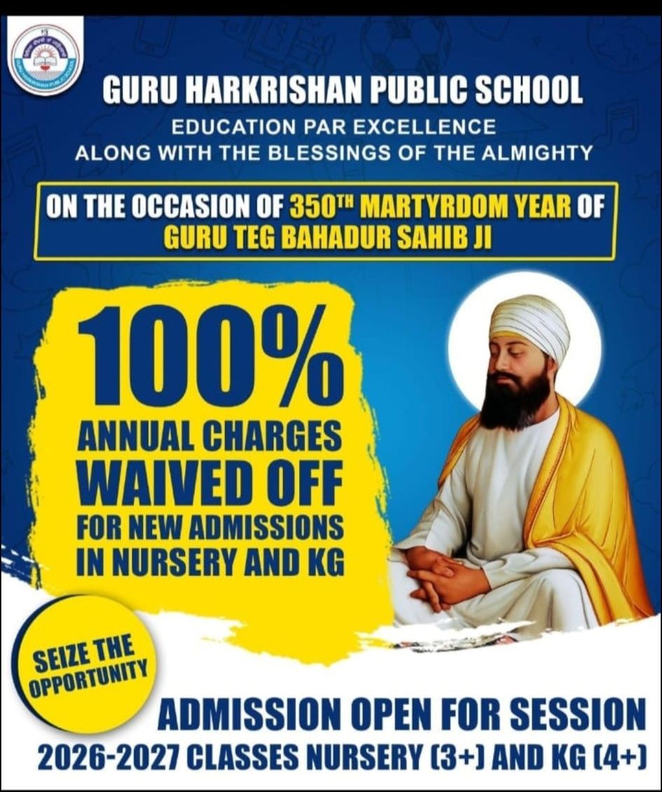 Album Title : We are pleased to inform you that Guru Harkrishan Public School is graciously offering a 100% waiver of annual charges for new admissions in Nursery (3+) and KG (4+) for the academic session 2026–2027, in honor of the 350th martyrdom year of Guru T